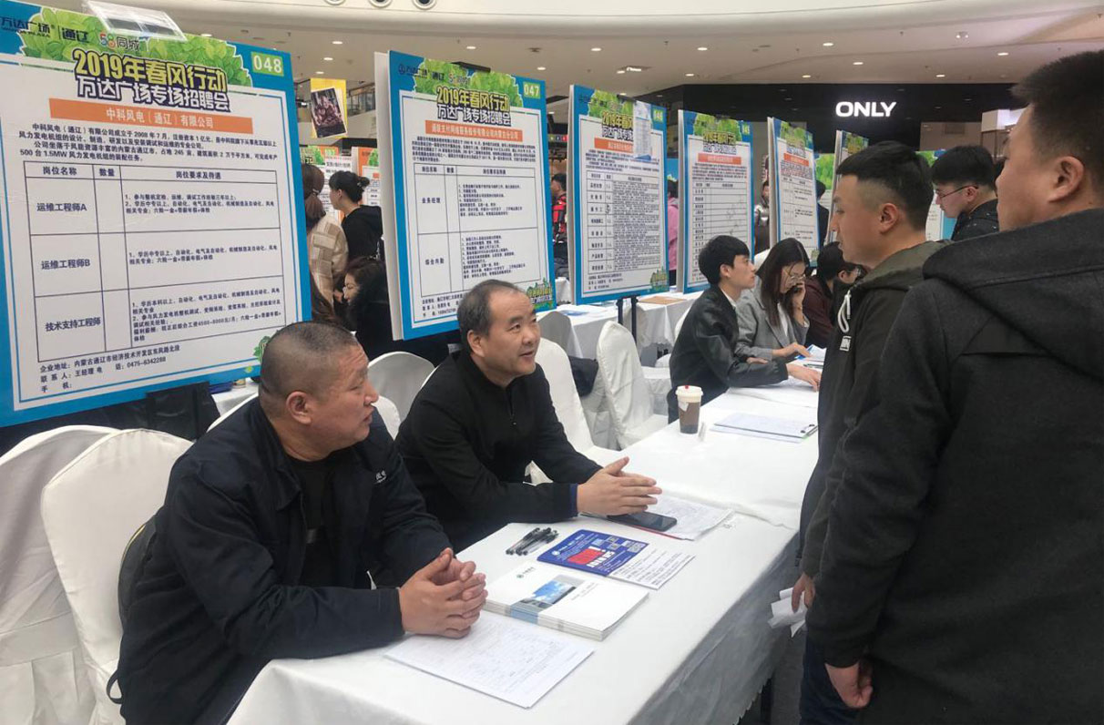 2019年3月7日至15日,中科風(fēng)電(通遼)有限公司積極參與了開發(fā)區(qū)“春風(fēng)行動”招聘會、萬達(dá)廣場專場招聘會和通遼市首屆退伍軍人專場招聘會。